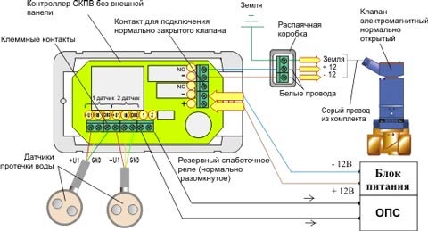 Кабель должен быть ЭКРАНИРОВАННЫМ (2 витые пары в экране, сечением не менее 0.35мм). Длина кабеля может быть не более 100 м. Соединение кабеля датчика протечки воды надо проводить через распаянную коробку.