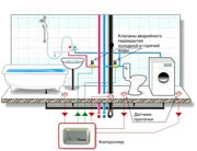 В местах возможной протечки воды расставляются датчики протечки, которые устанавливаются на полу и реагируют на появление влаги. По сигналу с датчика срабатывают клапаны, которые перекрывают подачу холодной и горячей воды на входе магистрали в дом или выключают нагнетательный насос.